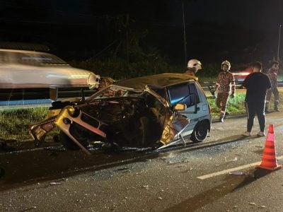 (古晋6日讯)轿车撞上罗里尾部,导致女司机夹毙车里。