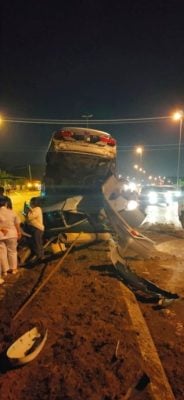 (古晋6日讯)两车发生猛烈撞击刑成“叠罗汉”,造成一名妇女受伤送院。