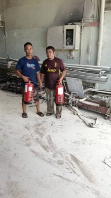 2名热心厂工合力使用灭火器朝起火的电表狂喷,成功将火势扑灭,阻止火势蔓延。2人也获得事后到场消拯员的赞许。