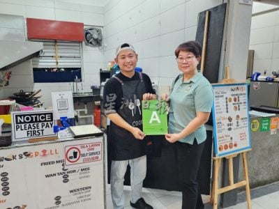 诗巫市议会市场与小贩组主任丁华凤(右)将A级卫生评估贴纸移交亲善美食园一熟食摊位小贩。