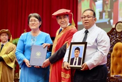 (诗巫8日讯)砂拉越科技大学在今日举行的毕业典礼上,特别追授已故毕业生约翰杰雷尔电机工程荣誉学士学位。对57岁的母亲珍妮及父亲约瑟夫来说,上台代领儿子的学位,既是悲伤的纪念,也是甜美的心愿实现。