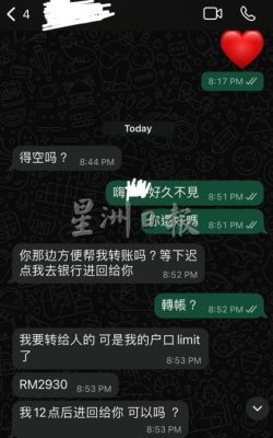 其中一名女志工接到的讯息是骗子声称需转账给他人的金额为2930令吉,并指将于午夜12时归还款项。