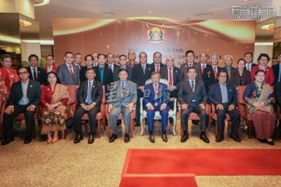 砂总理阿邦佐哈里(前坐者左五)及砂达雅国民协会成员大合影;坐者左四为该会会长威廉玛旺。(砂总理署脸书图)