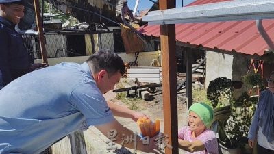 (美里16日讯)大火无情,灾民有爱!灾区老妇送上一袋冰条给冒着烈日视察灾区的议员及警员等解暑,暖心举动为现场每个人带来感动与力量。