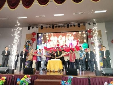 巴达旺市议会主席陈开(前排右八)等主持切蛋糕仪式。前排右二起为校董会主席林德喜、市议员郑国栋、本曼查陈君义、拿督叶金来、峇都吉当区议员拿督罗克强的代表市议员吴得瑜、古晋市国会议员俞利文;前排左四起为市议员刘儱语、市议员郑志国、天猛公拿督陈如飞、峇都林当区议员施志豪、拿督杨昆贤和砂拉越佛教会幼儿园园长蔡淑桦。