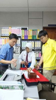 伊尔蒂娜巴翠希雅(中)小心翼翼拆开来自热心读者寄来的包裹,当看见心心念念的全新二胡时,感动之情溢于言表。右为陈超耀的机要秘书谢家洪;左为黄孝铭。