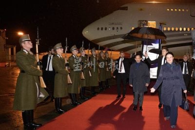 苏丹抵达布达佩斯李斯特费伦茨国际机场时,获得仪仗队列队迎接。匈牙利山多尔宫总干事西尔韦斯特及山多尔宫礼宾处处长卡丁卡在场迎接。