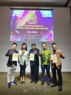 在常青集团配合庆祝50周年庆所主办的“2025常青好声音歌唱比赛”总决赛,3位评审即唐伟铭(中)、刘久钢(左)及黄明杰(右)与常青集团执行董事兼世华媒体集团主席张聪(左二)及常青集团50周年庆典工委会主席邓惟通(右)合照。(档案照)