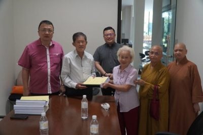 2022年7月,三圣佛堂一行人在主席沈林素卿(右三)一行人的带领下,拜访利安集团董事长兼创办人拿督陈悦枝(左二),以就三圣文教中心兴建工程安排签约仪式。左为拿督蔡文铎,右起为三圣佛堂监院觉贵法师及住持佛声法师,后为理事李汉文。(档案照)