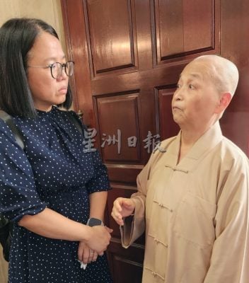 佛声法师(右)向本报何俐萍追忆已故沈林素卿一生心系三圣佛堂的感人情怀。