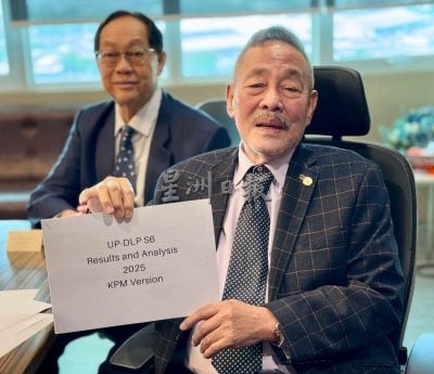 砂教育、创新及才能发展部长罗伦沙嘉(右)展示砂首届双语教学评估考试成绩。左为副部长(才能发展部)法兰斯哈丁。