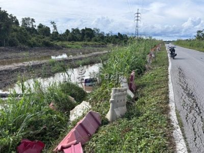 (马鲁帝21日讯)马鲁帝对岸靠近马鲁帝大桥路段今午发生一宗惊险意外。一辆行驶中的轿车疑因爆胎失控,猛然冲出车道,直接跌入积水的深沟内。车内3名成年人与2名孩童所幸及时逃生,无人受困。