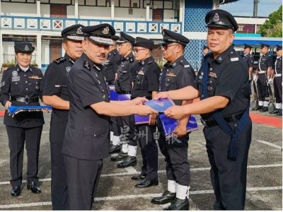 莫哈末再纳(左三)在砂副警察总监赛夫里扎(左二)陪同下,颁发表扬状予工作表现优越的警员。