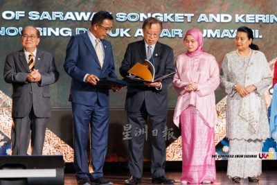 (古晋27日讯)为纪念已故砂总理夫人拿督阿玛祖玛安妮在马来金丝绣(Keringkam)与宋吉(Songket)的贡献,砂旅游、创意产业及表演艺术部今日推展《砂拉越宋吉与马来金丝绣的复兴》纪念书,一个动人的瞬间成为全场焦点,其女儿达央诺姬韩在播放回顾母亲一生的特别视频时,情不自禁流下泪水,场面令人动容。