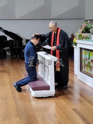 在按立仪式中,砂拉越卫理公会华人年议会会长刘会明牧师为9名长牧洗脚,象征以谦卑的心态来服事。长牧的家属也上台为他们穿上牧师袍,以示家庭对长牧们献身服事主的支持。