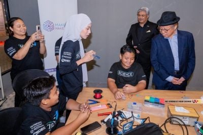 砂总理阿邦佐哈里(右)观看儿童参与科技及工艺活动。(砂总理署公关单位图)