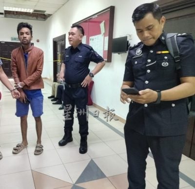 警员将被告(左)押抵法庭。