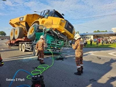 (美里3日讯)埔奕湾通往美里捷道的红绿灯路口今午发生夺命车祸,一辆牵引车在运载一辆矿用自卸卡车时,疑在紧急刹车时引发前冲,导致自卸卡车滑向前方,压中牵引车车头,造成车内2人当场丧命。