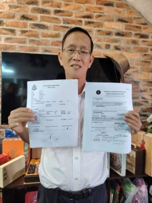 诗巫永安亭大伯公庙前福利黄寿源出示他在今年内,致函给诗巫警方及诗巫反贪污委员会的相关信件。