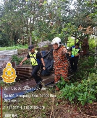 (古晋7日讯)石隆门甘榜斯格(Kpg Skio)今早惊传上吊轻生悲剧,消拯员受召协助把男子尸体从住家旁一棵3米高的树上移下。