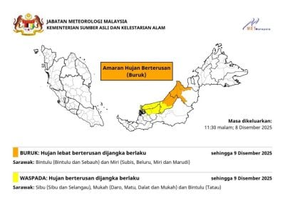 根据气象局昨晚发布的警报,严重级别的持续性豪雨预计将影响民都鲁(民都鲁及实巴荷)、美里(苏必士、柏鲁鲁、美里及马鲁帝)地区。