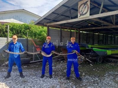 (美里11日讯)雨季不仅在尼亚及柏戈奴区突发闪电水患,也导致毒蛇频频出没,柏戈奴区昨日更惊现一条长达4公尺的大蟒蛇闯入居民鸡寮,吓得住户惊魂未定。