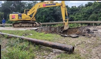 美里省长嘉隆表示,砂公共工程局正从仓库调派2套直径1.8公尺的临时双高密度聚乙烯涵管,运送至事发地点,预计在今午运抵拖工。