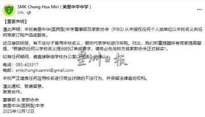 (美里13日讯)美里中华(国民型)中学董事部及家教协会从未授权任何个人或单位,以美中名义向任何商家订购产品或服务,家长及社会各界受促留意。