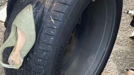 一名女子在社交媒体上分享了一组照片,展示她的汽车轮胎被一个乱丢在路上的高跟鞋扎破而爆胎,令人惊讶的是,鞋跟从轮胎拔出后,依然挺立完好。