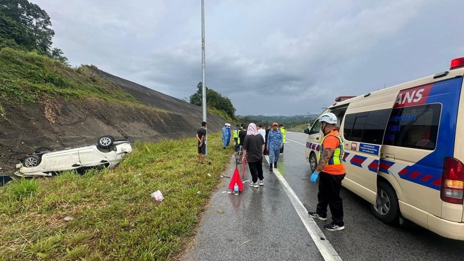 雨天路滑酿祸,一辆轿车失控冲到路边撞上洋灰山壁后翻覆,造成一名18岁女子死亡,另两人受伤送院治疗。