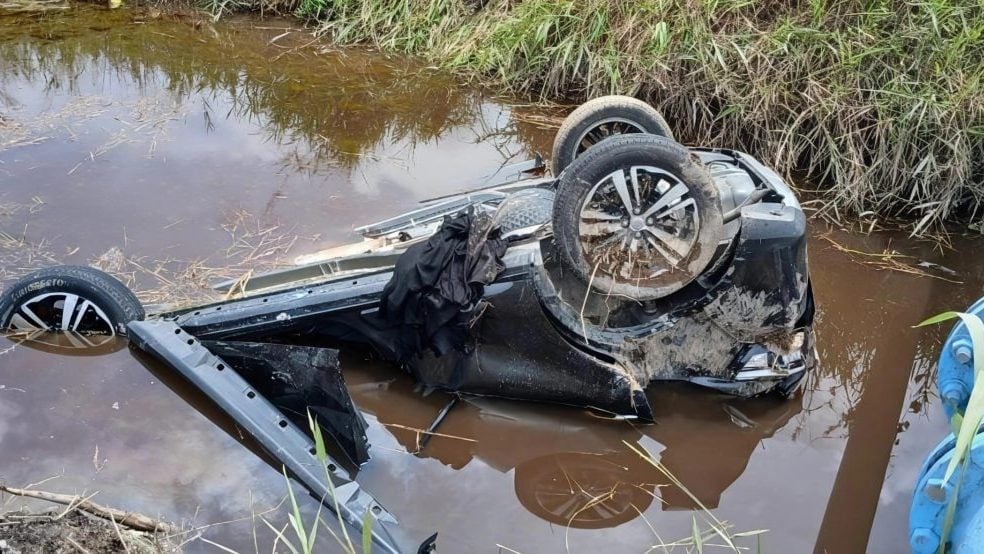 疑不熟悉路况,车子进入交通圈时速度过快导致失控,撞向路旁水沟翻覆四轮朝天,车子更泡在水里,所幸男司机临危不乱,打开车门逃生。