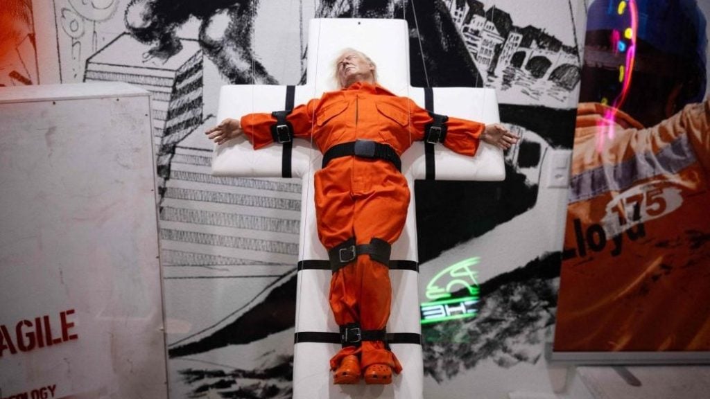 一座栩栩如生、酷似美国总统特朗普形象的人偶身穿橘色囚服并被绑在十字架上的雕塑,本周在瑞士展出,引发热烈讨论,也让现场出现不少笑声。