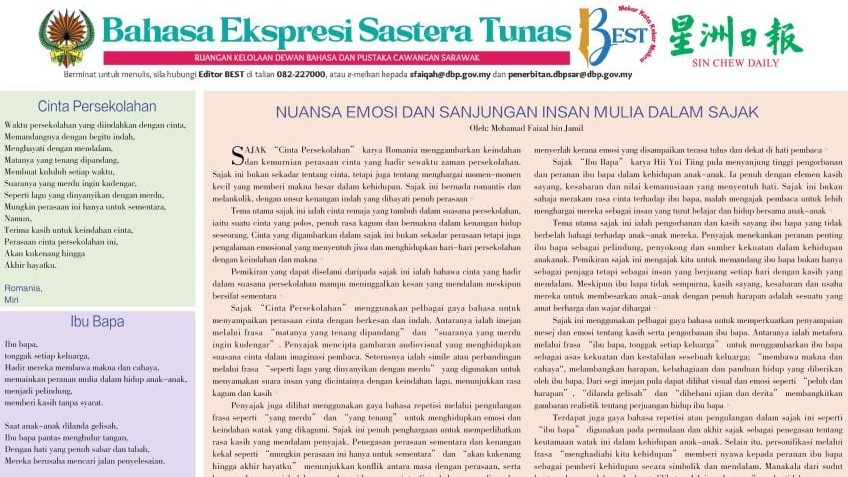 语文出版局砂拉越分局与星洲日报携手合作推广学习国文,2023年4月起,推出名为“语文的表达是文学的根基”(Bahasa Ekspresi Sastera Tunas)栏目。 有关栏目将在每个月推出一次。联办单位也欢迎民众通过扫描QR Code发送作品。 Simbolisme dan Nilai Persahabatan dalam Sajak Oleh: Mohamad Faizal bin Jamil SAJAK “Luahan Seorang Anak” karya Chai Siew Fang merupakan ekspresi emosi yang tulus daripada seorang anak yang merasakan kesulitan dan pengorbanan yang dilakukan oleh ayah dan ibunya dalam mencari nafkah. Sajak ini menggunakan bahasa yang sederhana namun efektif dalam menyampaikan perasaan anak tersebut. Sajak ini bertemakan penghargaan dan kasih sayang anak terhadap orang tuanya. Anak tersebut ingin menyatakan “terima kasih” kepada ayah dan ibunya atas susah payah mereka dalam membesarkannya. Pemikiran yang terdapat dalam sajak “Luahan Seorang Anak” ini ialah pemikiran yang menghargai dan menghormati pengorbanan orang tua. Anak tersebut melihat keadaan orang tua yang telah lanjut usia dan lelah. Selain itu, sajak ini juga menggambarkan perasaan anak yang merasakan tanggungjawab terhadap orang tua mereka. Gaya bahasa yang digunakan sederhana dan bersahaja. Sajak ini menggunakan bahasa yang mudah difahami dan tidak terlalu kompleks. Selain itu, sajak ini juga menggunakan metafora dalam menggambarkan perasaan anak terhadap orang tua mereka. Contohnya, “keringat ayah” dan “air mata ibu” merupakan metafora yang menggambarkan kesulitan dan pengorbanan yang dialami oleh orang tua. Sajak ini juga menggunakan simile dalam menggambarkan perasaan anak terhadap orang tua mereka. Contohnya, “raut wajah ayah” dan “garis tua ibu” merupakan simile yang menggambarkan keadaan orang tua yang telah tua dan keletihan. Walaupun gaya bahasa yang digunakan dalam sajak “Luahan Seorang Anak” ini adalah sederhana dan bersahaja, namun masih dapat menyampaikan perasaan anak terhadap orang tua mereka dengan efektif. Sajak ini juga menggunakan simbolisme yang kuat dalam menyampaikan makna. Selain itu ia menunjukkan perasaan dan emosi anak yang merindui dan menghargai pengorbanan orang tuanya. Perasaan ini ditunjukkan melalui kata-kata seperti “ingin ia peluk” dan “ingin ia teriak”. Gambaran perasaan yang tulus menunjukkan pengertian anak terhadap kesulitan dan pengorbanan yang dilakukan oleh ayah dan ibunya dalam mencari nafkah. Sajak ini tentu akan lebih baik jika penulis mahu memasukkan variasi dalam penggunaan bahasa. Penulis dicadangkan untuk memasukkan gaya bahasa seperti seperti personifikasi, hiperbola atau aliterasi bagi menambah keindahan sajak. Namun simbolisme yang kuat dan perasaan yang mendalam membuat sajak ini menjadi sangat menyentuh hati. Sajak “Daripada Sahabatmu” karya Kim Yong Zhen merupakan ekspresi emosi yang tulus daripada penulis kepada sahabatnya. Sepertimana sajak sebelum ini, sajak ini juga digarap dengan bahasa yang sederhana namun efektif dalam menyampaikan perasaan penulis. Sajak ini terdiri dari empat rangkap yang masing-masing memiliki tema yang berbeza, namun tetap terkait dengan perasaan penulis terhadap sahabatnya. Tema yang terdapat dalam sajak ini ialah persahabatan yang tulus dan abadi. Penulis mengungkapkan perasaan terhadap sahabatnya yang sangat berharga dan penting dalam hidupnya. Tema ini dapat dilihat dari beberapa aspek, antara lainnya kesatuan dan kepentingan sahabat, rasa terima kasih, kesetiaan dan keabadian, dan kesedaran akan nilai sebuah persahabatan. Pemikiran yang terdapat dalam sajak “Daripada Sahabatmu” ini ialah pemikiran yang menghargai dan menghormati persahabatan. Gaya bahasa yang sederhana dan langsung dapat dilihat dari penggunaan kata-kata yang tidak terlalu kompleks seperti “sahabatku”, “tercinta”, “dikasihi” dan “setia”. Sajak ini menggunakan metafora yang sederhana seperti “kita bagai udara dan air, […]