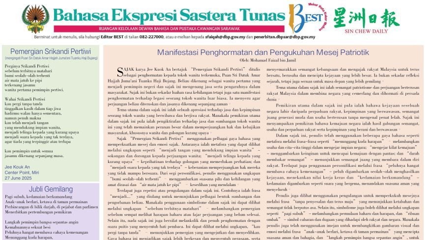 语文出版局砂拉越分局与星洲日报携手合作推广学习国文,2023年4月起,推出名为“语文的表达是文学的根基”(Bahasa Ekspresi Sastera Tunas)栏目。 有关栏目将在每个月推出一次。联办单位也欢迎民众通过扫描QR Code发送作品。 Manifestasi Penghormatan dan Pengukuhan Mesej Patriotik Oleh: Mohamad Faizal bin Jamil SAJAK karya Jee Kuok An bertajuk “Pemergian Srikandi Pertiwi” ditulis sebagai penghormatan kepada tokoh wanita terkemuka, Puan Sri Datuk Amar Hajjah Juma’ani Tuanku Haji Bujang. Beliau dikenang sebagai wanita pertama yang menjadi pemimpin negeri dan sajak ini mengenang jasa serta pengaruhnya dalam masyarakat. Sajak ini bukan sekadar luahan rasa kehilangan tetapi juga satu manifestasi penghormatan terhadap legasi seorang tokoh wanita luar biasa. Ia menyeru agar perjuangan beliau diteruskan dan jasanya dikenang sepanjang zaman. Tema utama dalam sajak ini ialah sebuah apresiasi terhadap jasa dan kepimpinan seorang tokoh wanita yang berwibawa dan berjiwa rakyat. Manakala pemikiran utama dalam sajak ini pula ialah pengiktirafan terhadap jasa dan sumbangan tokoh wanita ini yang telah memainkan peranan besar dalam memperjuangkan hak dan kebajikan masyarakat, khususnya wanita dan golongan kurang upaya. Sajak “Pemergian Srikandi Pertiwi” menggunakan pelbagai gaya bahasa yang memperkuatkan mesej dan emosi sajak. Antaranya ialah metafora yang dapat dilihat melalui ungkapan seperti “menjadi tangan yang mendukung impian wanita” – sokongan dan dorongan kepada perjuangan wanita; “menjadi telinga kepada yang kurang upaya” – keprihatinan terhadap golongan yang memerlukan perhatian; dan “menjadi suara kepada yang tak terdaya” – keberanian memperjuangkan hak mereka yang tidak mampu bersuara. Dari segi personifikasi, penulis menggunakan ungkapan “bumi seolah-olah terhenti” – menggambarkan suasana pilu dan kehilangan yang amat dirasai dan “air mata jatuh ke pipi” – kesedihan yang mendalam. Terdapat juga repetisi atau pengulangan dalam sajak ini. Contohnya ialah frasa “menjadi…” yang diulang untuk menunjukkan pelbagai bentuk sumbangan dan pengorbanan beliau. Manakala penggunaan simbolisme dalam sajak ini dapat dilihat melalui ungkapan “sebelum terbitnya matahari” – melambangkan pemergian sebelum sempat melihat harapan baharu atau fajar perjuangan yang belum selesai. Selain itu, nada sajak ini juga bersifat melankolik dan penuh penghormatan dengan suara puitis yang menyentuh hati pembaca. Ini dapat dilihat melalui ungkapan, “kau pergi tanpa tanda” – menunjukkan pemergian yang mengejutkan dan menyedihkan. Gaya bahasa ini menjadikan sajak lebih berkesan dan menyentuh perasaan, serta memperkukuh mesej penghargaan terhadap tokoh wanita yang telah banyak berjasa. Kekuatan sajak ini antaranya ialah temanya yang menyentuh hati. Selain itu penulis juga menggunakan gaya bahasa yang indah dan berkesan yang dapat mengajak pembaca menjiwai sajak ini. Kekuatan yang lain ialah nada penghormatan penulis terhadap tokoh wanita ini selain daripada strukturnya yang disusun kemas dalam rangkap yang jelas dan mudah difahami. Walau bagaimanapun, pengulangan yang agak banyak melalui penggunaan frasa seperti “menjadi…” dalam rangkap kedua boleh dianggap berlebihan jika tidak diimbangi dengan variasi gaya. Selain itu, sajak ini kurang mengetengahkan elemen kejutan atau kelainan dan agak konvensional dalam menggambarkan pemergian dan penghargaan tokoh. Kurangnya latar atau gambaran peribadi tokoh juga boleh dikatakan sebagai kelemahan sajak ini. Sajak ini boleh diperkemas dengan lebih banyak variasi gaya dan gambaran peribadi untuk menjadikannya lebih berkesan secara artistik. Sajak “Jubli Gemilang” karya Kong Yi Yan pula merupakan sajak yang menyemarakkan semangat kebangsaan dan mengajak rakyat Malaysia untuk terus bersatu, berusaha dan mencipta kejayaan yang lebih besar. Ia bukan sekadar refleksi sejarah, tetapi juga seruan […]