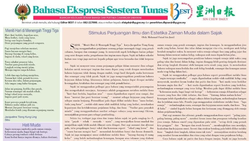 语文出版局砂拉越分局与星洲日报携手合作推广学习国文,2023年4月起,推出名为“语文的表达是文学的根基”(Bahasa Ekspresi Sastera Tunas)栏目。 有关栏目将在每个月推出一次。联办单位也欢迎民众通过扫描QR Code发送作品。 Stimulus Perjuangan Ilmu dan Estetika Zaman Muda dalam Sajak Oleh: Mohamad Faizal bin Jamil SAJAK “Meniti Hari di Menengah Tinggi Tiga” karya Jacqueline Tiong Kung Ling menggambarkan perjalanan seorang pelajar menengah tinggi yang penuh cabaran, harapan dan semangat juang. Ia menyentuh aspek kehidupan harian pelajar yang sarat dengan usaha, pengorbanan dan impian masa depan. Sajak ini bukan sekadar luahan rasa tetapi juga motivasi kepada pelajar agar terus berusaha dan tidak berputus asa。 Sajak ini menyorot tema utama perjuangan pelajar dalam menuntut ilmusebagai bekalan untuk mencapai impian dan masa depan yang cerah dengan menekankan bahawa kejayaan tidak datang dengan mudah, tetapi hasil daripada usaha berterusan dan semangat yang tidak goyah. Sajak ini juga mengetengahkan pemikiran bahawa kejayaan dalam hidup, khususnya dalam pelajaran, hanya dapat dicapai melalui kesungguhan, ketabahan dan semangat yang tidak pernah luntur。 Sajak ini menggunakan pelbagai gaya bahasa yang memperindah penyampaian dan memperkukuh mesejnya. Antaranya adalah penggunaan metafora melalui frasa “hari-hari berlalu, bagaikan arus” – masa digambarkan seperti arus sungai, dan frasa “mentari Jun pasti bersinar terang” – mentari sebagai kejayaan yang dinanti selepas musim berjuang. Personifikasi pula dapat dilihat melalui frasa “masa berlari, tiada yang lurus”, seolah-olah masa ialah makhluk hidup yang berlari, menekankan kepantasan dan ketidaktentuan perjalanan hidup, dan frasa “Nasihat guru penyuluh minda” yang menggambarkan nasihat sebagai cahaya yang menerangi fikiran, menunjukkan peranan guru sebagai pembimbing。 Selain itu, terdapat juga rima dan irama dalam sajak ini pada rangkap ke-5, iaitu “payah – rebah – menyala – nyata”, yang mewujudkan kesan muzikal dan menjadikan sajak lebih mudah dihayati serta diingati. Dari segi asonansi dan aliterasi pula, iaitu pengulangan bunyi vokal dan konsonan seperti “tekad yang keras” dan “suara bacaan mengisi hari” menambah keindahan bunyi dan kesan dramatik. Sajak ini juga mempunyai unsur simbolisme melalui frasa “bayang-bayang di ruang kelas” yang boleh melambangkan kenangan, harapan atau tekanan yang dialami pelajar, dan frasa “benih yang ditanam sepanjang musim”, iaitu simbol kepada usaha yang berterusan yang akan membuahkan hasil. Akhir sekali, iaitu bahasa emotif yang digunakan oleh penulis seperti “penawar luka”, “hulur harapan” dan “semangat tak mudah rebah” membangkitkan rasa simpati, harapan dan kekuatan emosi。 Antara kekuatan sajak ini ialah temanya yang dekat dengan jiwa pelajar selain gaya bahasa yang indah dan berkesan. Penulis juga berjaya menggunakan nada motivasi dan positif untuk membangkitkan semangat, menanam harapan dan keyakinan sebagai pelajar. Struktur sajak ini juga teratur dan berirama. Namun, oleh sebab temanya yang agak klise, menyebabkan ia kurang menonjol. Gaya bahasa yang digunakan oleh penulis juga bersifat agak selamat, tidak terlalu eksperimental atau mencabar norma puisi moden – lebih kepada gaya konvensional. Penulis juga kurang memasukkan konflik atau ketegangan dramatik yang boleh menambah kedalaman emosi kerana sajak ini lebih bersifat reflektif dan berbentuk motivasi。 Sajak “Hati Muda” karya Toh Zheng Feng mengangkat keindahan dan kejujuran zaman remaja yang penuh semangat, impian dan kenangan. Ia menggambarkan jiwa muda yang bebas, berani dan tulus dalam mengejar cita-cita, meskipun arah hidup berubah mengikut waktu. Ia menyorot waktu remaja sebagai fasa yang paling jujur dan lantang dalam mencari makna […]