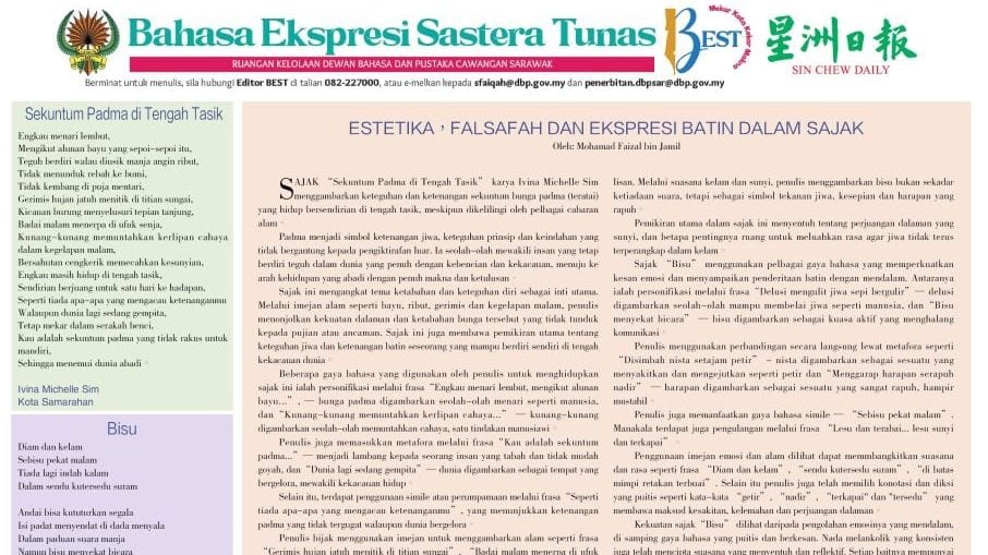 语文出版局砂拉越分局与星洲日报携手合作推广学习国文,2023年4月起,推出名为“语文的表达是文学的根基”(Bahasa Ekspresi Sastera Tunas)栏目。 有关栏目将在每个月推出一次。联办单位也欢迎民众通过扫描QR Code发送作品。 ESTETIKA, FALSAFAH DAN EKSPRESI BATIN DALAM SAJAK Oleh: Mohamad Faizal bin Jamil SAJAK “Sekuntum Padma di Tengah Tasik” karya Ivina Michelle Sim menggambarkan keteguhan dan ketenangan sekuntum bunga padma (teratai) yang hidup bersendirian di tengah tasik, meskipun dikelilingi oleh pelbagai cabaran alam. Padma menjadi simbol ketenangan jiwa, keteguhan prinsip dan keindahan yang tidak bergantung kepada pengiktirafan luar. Ia seolah-olah mewakili insan yang tetap berdiri teguh dalam dunia yang penuh dengan kebencian dan kekacauan, menuju ke arah kehidupan yang abadi dengan penuh makna dan ketulusan. Sajak ini mengangkat tema ketabahan dan keteguhan diri sebagai inti utama. Melalui imejan alam seperti bayu, ribut, gerimis dan kegelapan malam, penulis menonjolkan kekuatan dalaman dan ketabahan bunga tersebut yang tidak tunduk kepada pujian atau ancaman. Sajak ini juga membawa pemikiran utama tentang keteguhan jiwa dan ketenangan batin seseorang yang mampu berdiri sendiri di tengah kekacauan dunia. Beberapa gaya bahasa yang digunakan oleh penulis untuk menghidupkan sajak ini ialah personifikasi melalui frasa “Engkau menari lembut, mengikut alunan bayu…”, — bunga padma digambarkan seolah-olah menari seperti manusia, dan “Kunang-kunang memuntahkan kerlipan cahaya…” — kunang-kunang digambarkan seolah-olah memuntahkan cahaya, satu tindakan manusiawi. Penulis juga memasukkan metafora melalui frasa “Kau adalah sekuntum padma…” — menjadi lambang kepada seorang insan yang tabah dan tidak mudah goyah, dan “Dunia lagi sedang gempita” — dunia digambarkan sebagai tempat yang bergelora, mewakili kekacauan hidup. Selain itu, terdapat penggunaan simile atau perumpamaan melalui frasa “Seperti tiada apa-apa yang mengacau ketenanganmu”, yang menunjukkan ketenangan padma yang tidak tergugat walaupun dunia bergelora. Penulis bijak menggunakan imejan untuk menggambarkan alam seperti frasa “Gerimis hujan jatuh menitik di titian sungai”, “Badai malam menerpa di ufuk senja” dan “Kicauan burung… Bersahutan cengkerik...” — semua ini membentuk suasana yang tenang tetapi penuh cabaran, mencerminkan perjalanan hidup. Terdapat juga gaya bahasa pengulangan seperti “Tidak menunduk… Tidak kembang...”, menekankan pendirian padma yang tidak mudah terpengaruh. Walaupun, pengulangan imejan alam yang serupa dalam banyak baris boleh menyebabkan kesan monoton jika tidak diimbangi dengan baik, namun secara keseluruhannya, sajak ini mempunyai estetika dan falsafah yang kuat untuk ditekuni. Antara kekuatan sajak ini ialah gaya bahasanya yang digunakan mengesankan. Strukturnya juga konsisten, menjadikan aliran sajak lancar dan tidak terganggu, lantas menghasilkan pembacaan menyenangkan dan bermakna. Sajak “Bisu” karya Olivia Ngor pula mengungkapkan penderitaan batin dan kekangan emosi seorang individu yang tidak mampu meluahkan perasaan secara lisan. Melalui suasana kelam dan sunyi, penulis menggambarkan bisu bukan sekadar ketiadaan suara, tetapi sebagai simbol tekanan jiwa, kesepian dan harapan yang rapuh. Pemikiran utama dalam sajak ini menyentuh tentang perjuangan dalaman yang sunyi, dan betapa pentingnya ruang untuk meluahkan rasa agar jiwa tidak terus terperangkap dalam kelam. Sajak “Bisu” menggunakan pelbagai gaya bahasa yang memperkuatkan kesan emosi dan menyampaikan penderitaan batin dengan mendalam. Antaranya ialah personifikasi melalui frasa “Delusi mengulit jiwa sepi bergulir” — delusi digambarkan seolah-olah mampu membelai jiwa seperti manusia, dan “Bisu menyekat bicara” — bisu digambarkan sebagai kuasa aktif yang menghalang komunikasi. Penulis menggunakan perbandingan secara langsung lewat metafora seperti “Disimbah nista setajam petir” – nista digambarkan sebagai sesuatu yang […]